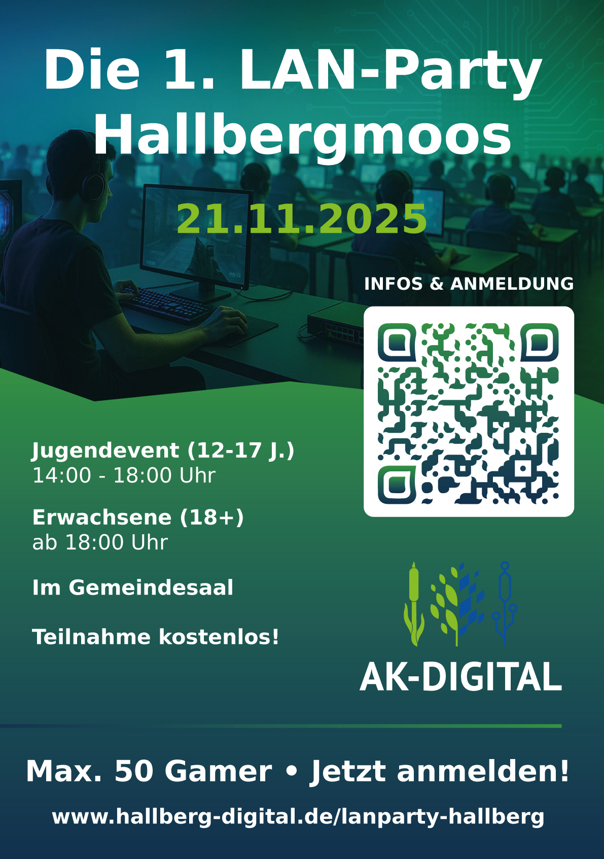 Der AK-Digital lädt zur 1. LAN-Party Hallbergmoos ein – gemeinsames Zocken im schnellen lokalen Netzwerk mit kurzer Latenz und viel Austausch. Es gibt zwei Slots: Jugendliche von 12–17 Jahren (ohne USK-18-Titel) und Erwachsene ab 18. Gespielt werden bewährte Multiplayer-Klassiker und aktuelle E-Sport-Titel, z. B. Trackmania, Counter-Strike 2, Minecraft oder Among Us; spontane Mini-Turniere sind geplant.